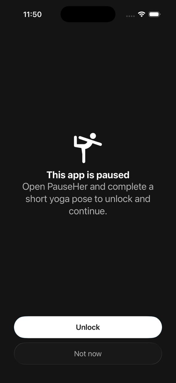 When you tap a locked app, PauseHer invites you to hold a short yoga pose. Your camera and on-device pose detection guide you—just a quick pose, then unlock. Earn your scroll with a moment of mindfulness.