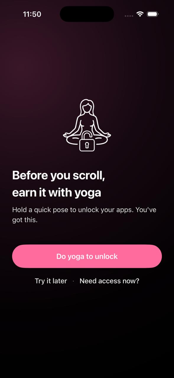 You earn your scroll with a quick pose. You pick up a little about yoga along the way, and it's helped me build a better habit around when I reach for my phone. Been using it a couple weeks and it's made a real difference.